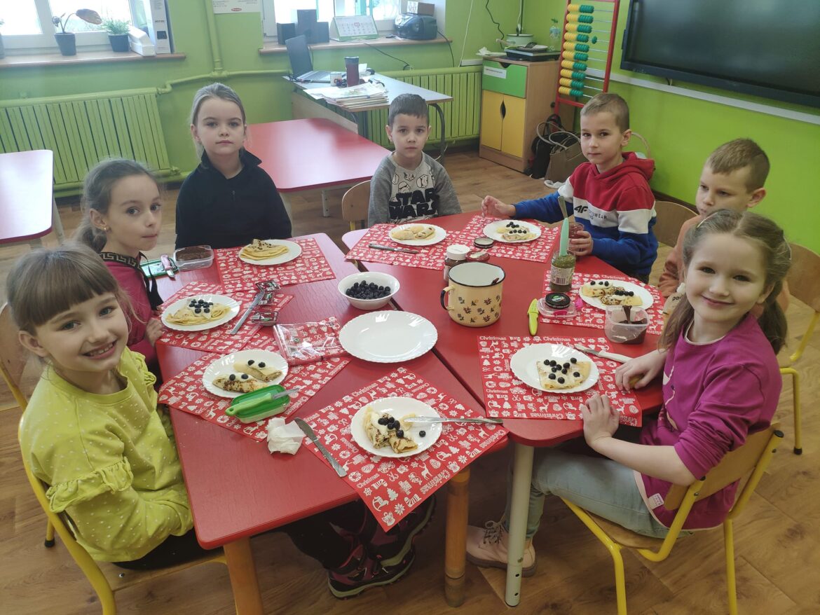 Pierwszacy w ramach zajęć kulinarnych przygotowali ciasto naleśnikowe i bitą śmietanę. Upieczone naleśniki każdy z uczniów przyrządził według własnego upodobania. To była „smaczna lekcja”😋.