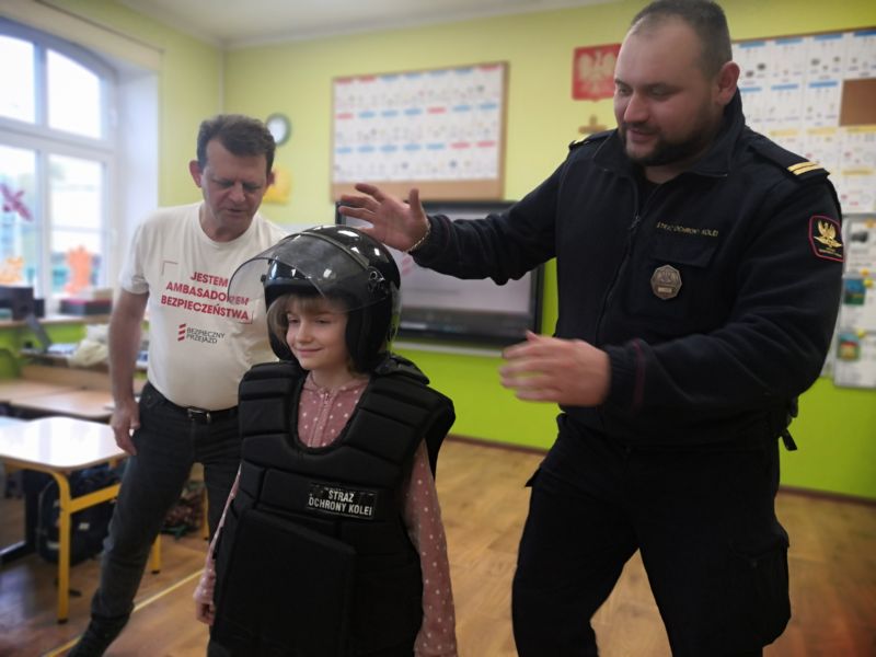 Co roku w okresie jesiennym naszą szkołę odwiedza wyjątkowy gość, jej wieloletni przyjaciel – pan Jarosław Chmielarz, Ambasador Bezpieczeństwa PKP Polskich Kolei Państwowych S.A. Październik jest miesiącem, w którym pracownicy PKP skupiają się na ważnych kwestiach takich, jak bezpieczeństwo na przejazdach kolejowo- drogowych. To właśnie kampania „Bezpieczny przejazd” była celem wizyty pana Chmielarza i jego współpracowników – Strażników Ochrony Kolei.