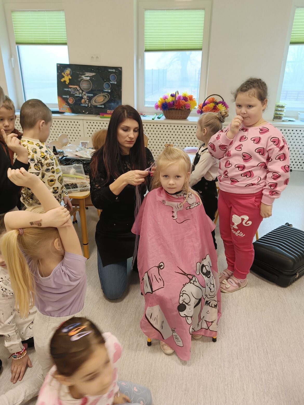 Największą atrakcją dla przedszkolaków było czesanie przeróżnych fryzur. Dziękujemy pani Oli za przybliżenie tego zawodu. Być może któreś z dzieci w przyszłości zostanie fryzjerem bądź fryzjerką?