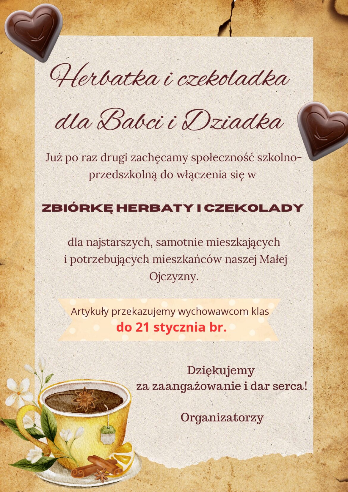 Zachęcamy do włączenia się w naszą akcję charytatywną. Przedsięwzięcie polega na zbiórce herbaty i czekolady dla najstarszych, samotnie mieszkających mieszkańców naszej okolicy. Podarujmy Im odrobinę radości!