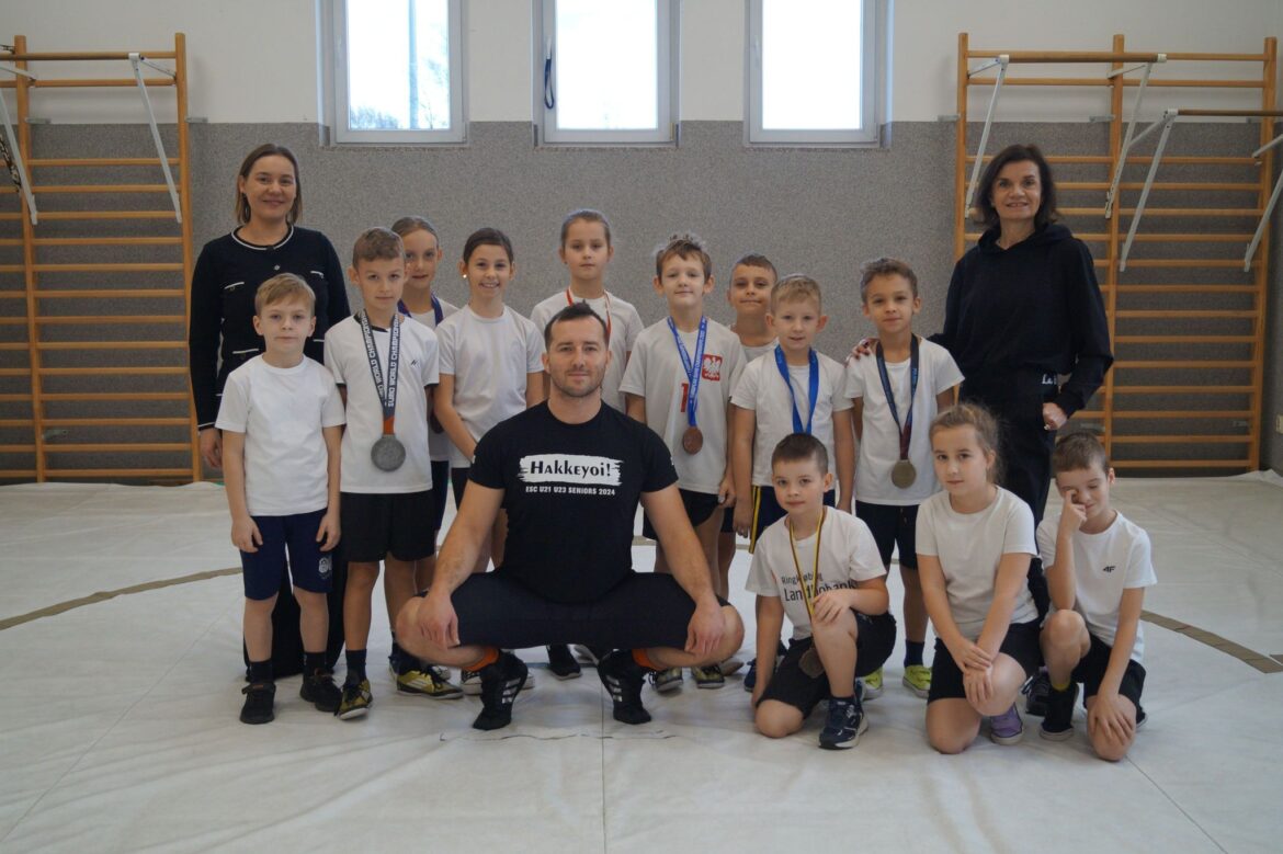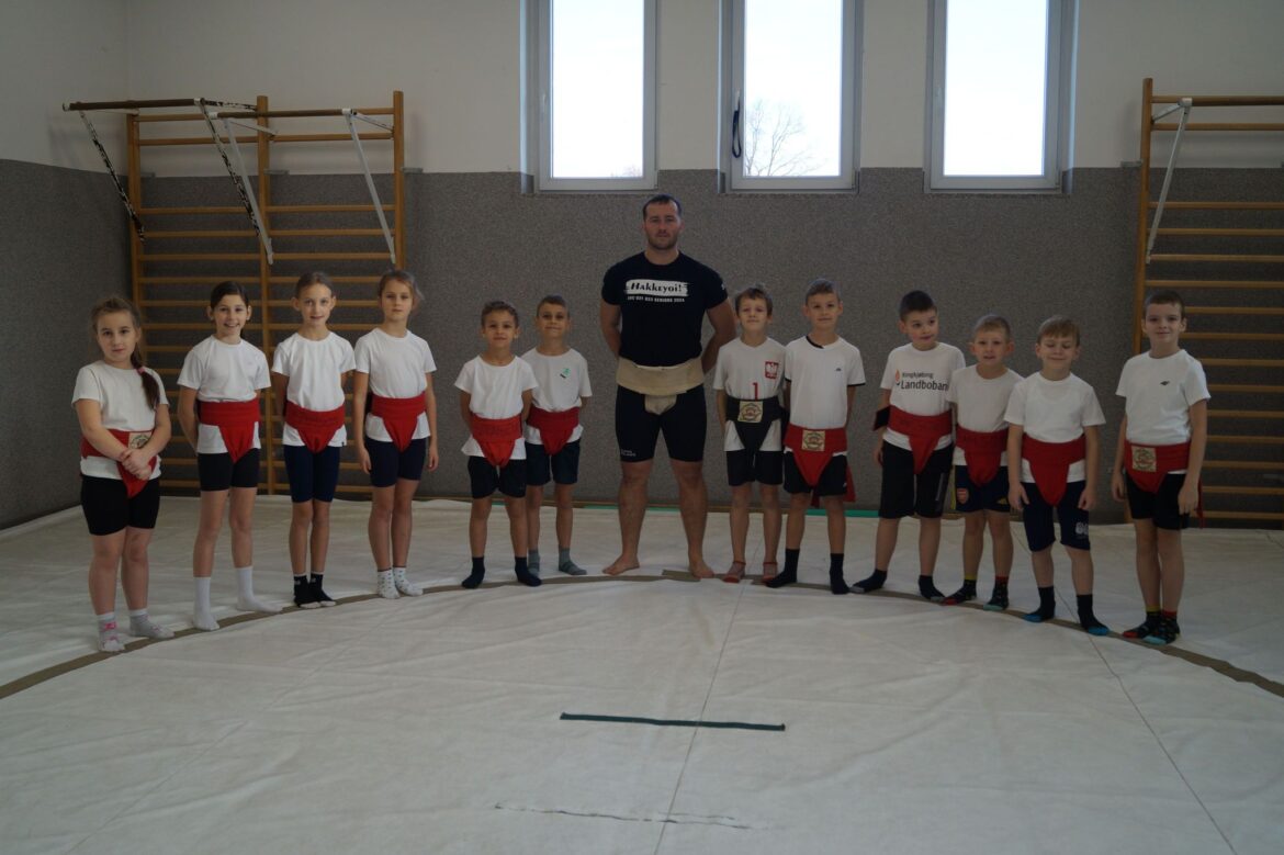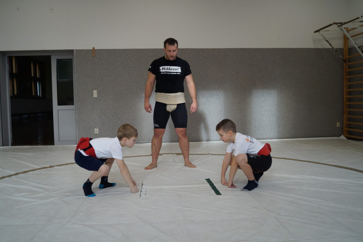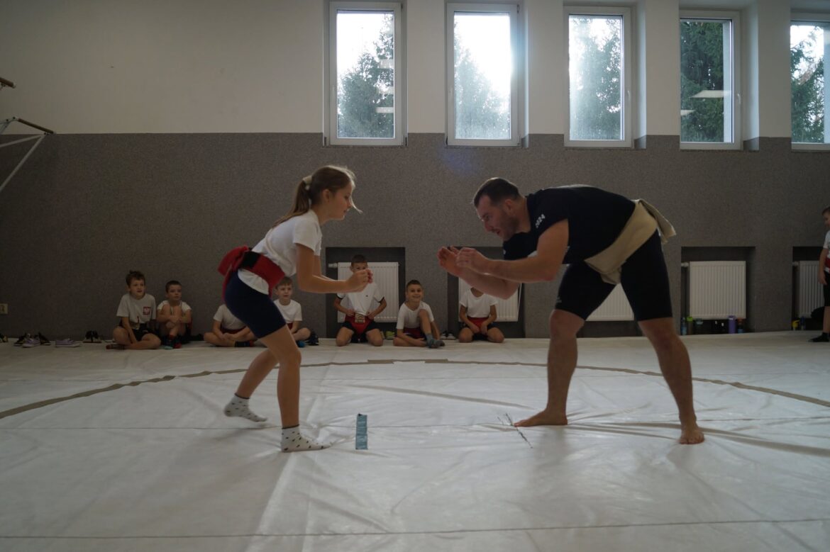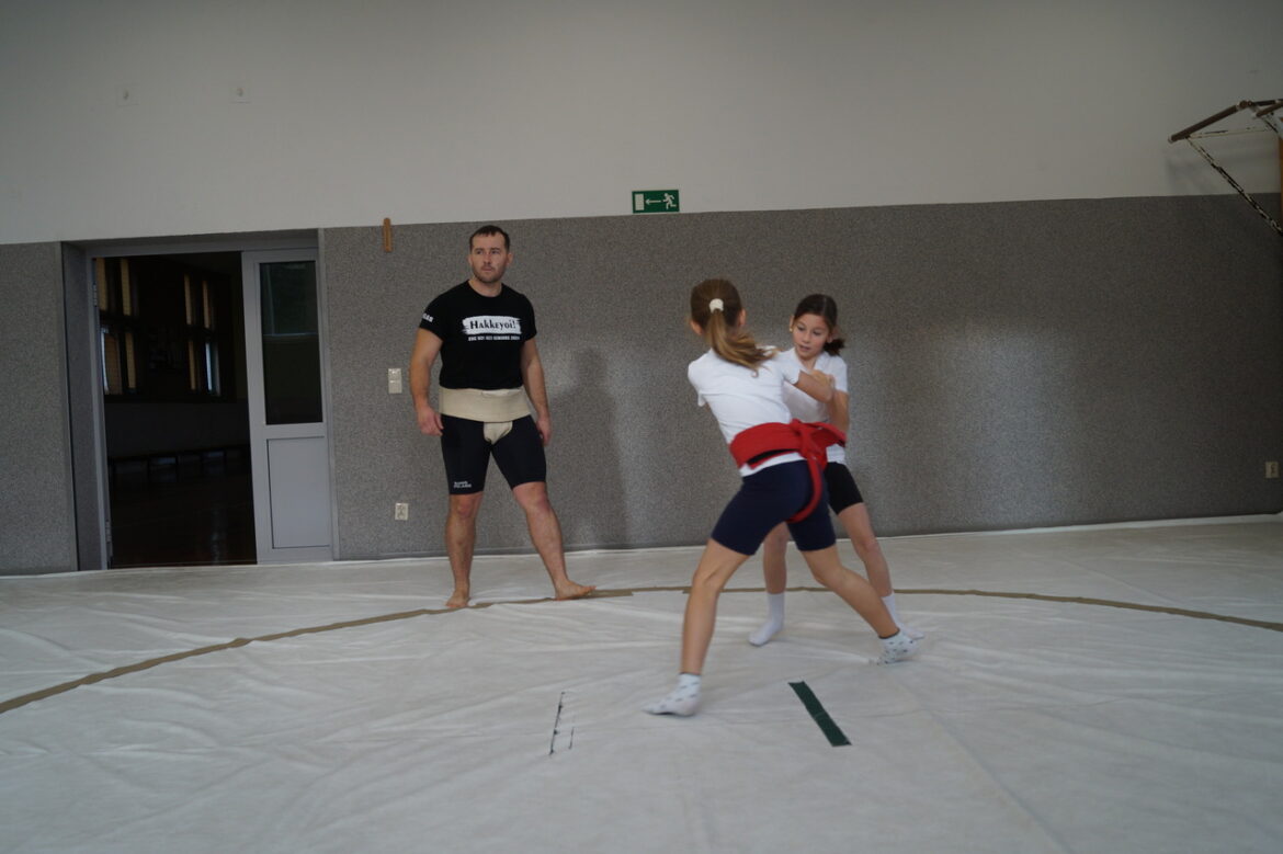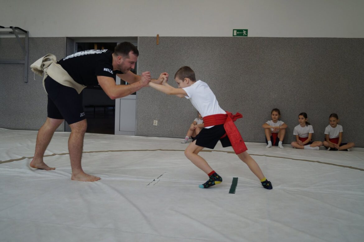 Uczniowie klasy II mieli okazję poznać tajniki japońskiego sportu narodowego, wzięli też udział w treningu sumo, walczyli ze sobą, a nawet z samym mistrzem. Przez chwile mogli też poczuć się mistrzami, zakładając zdobyte przez pana Patryka medale.