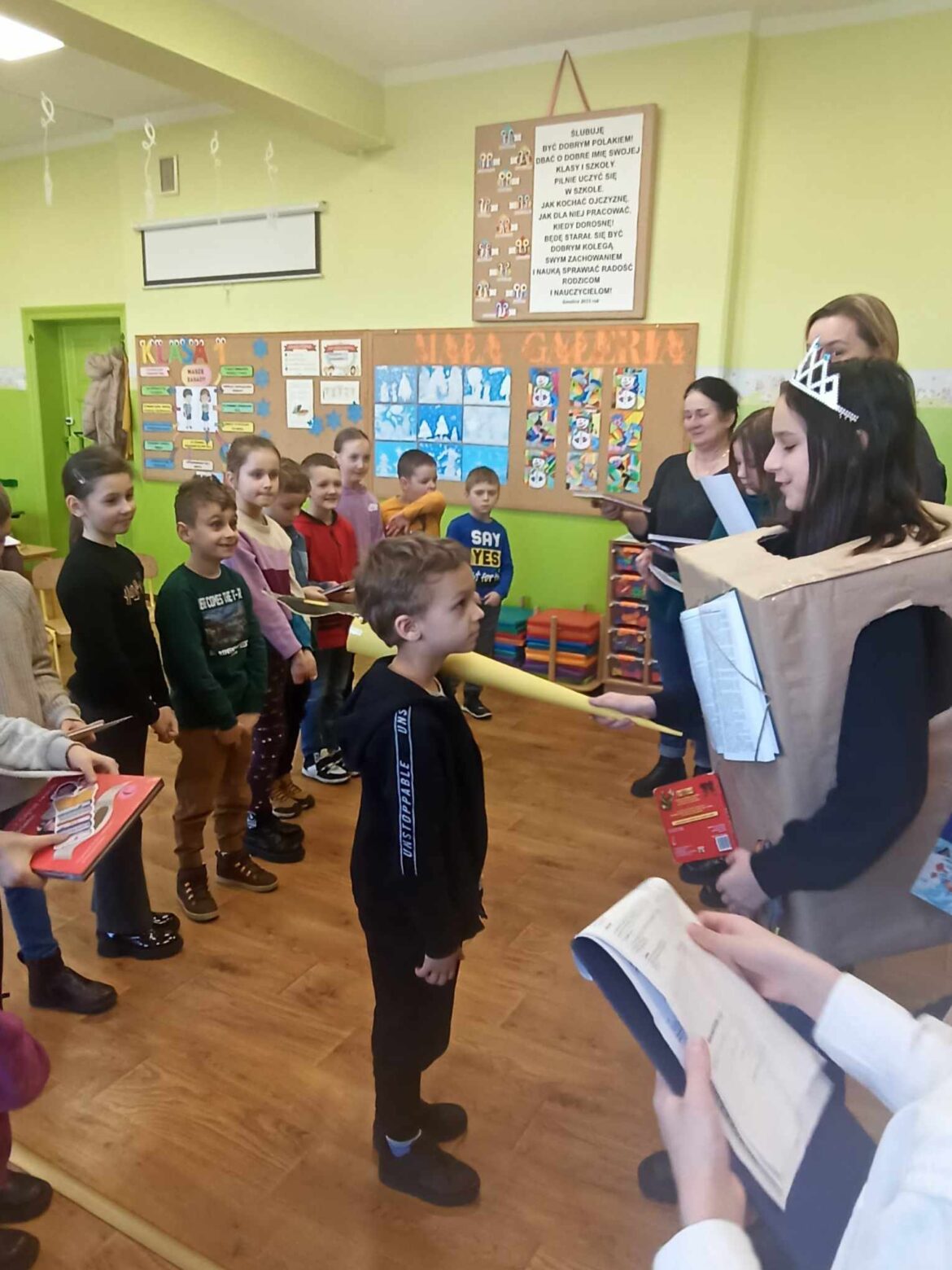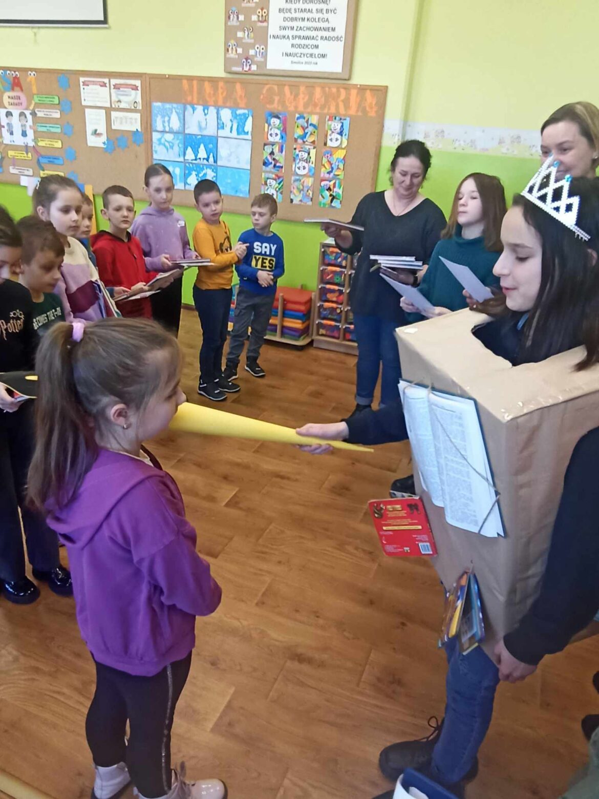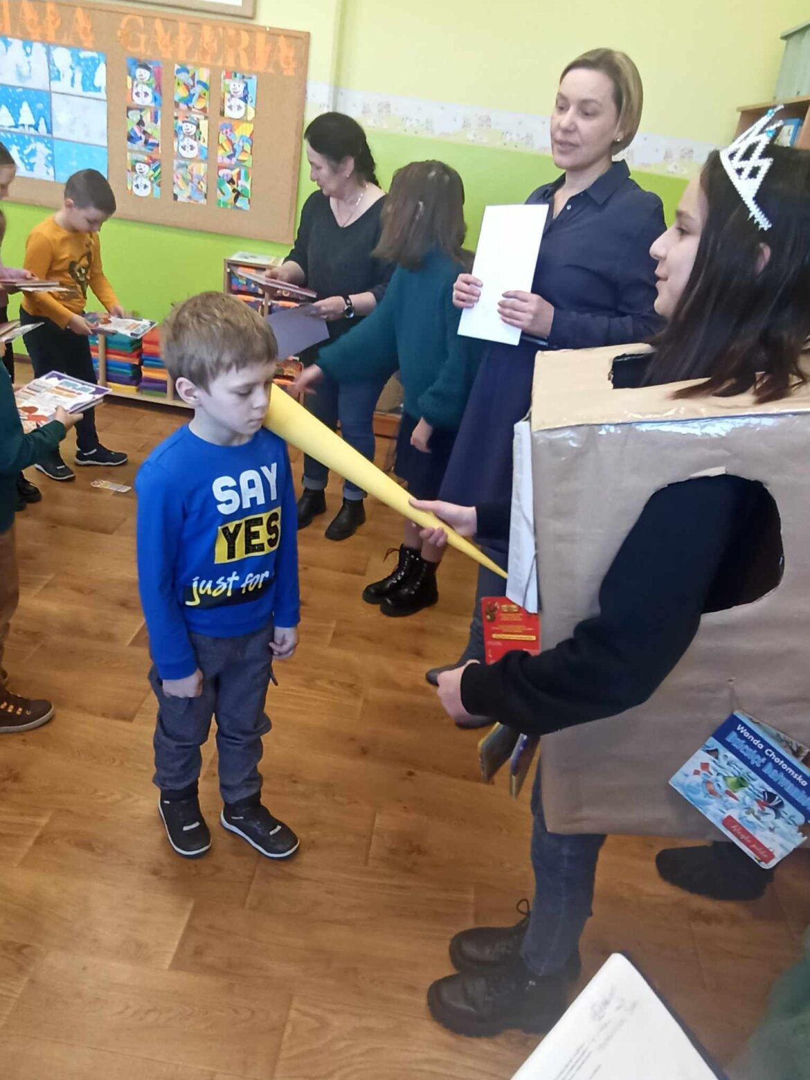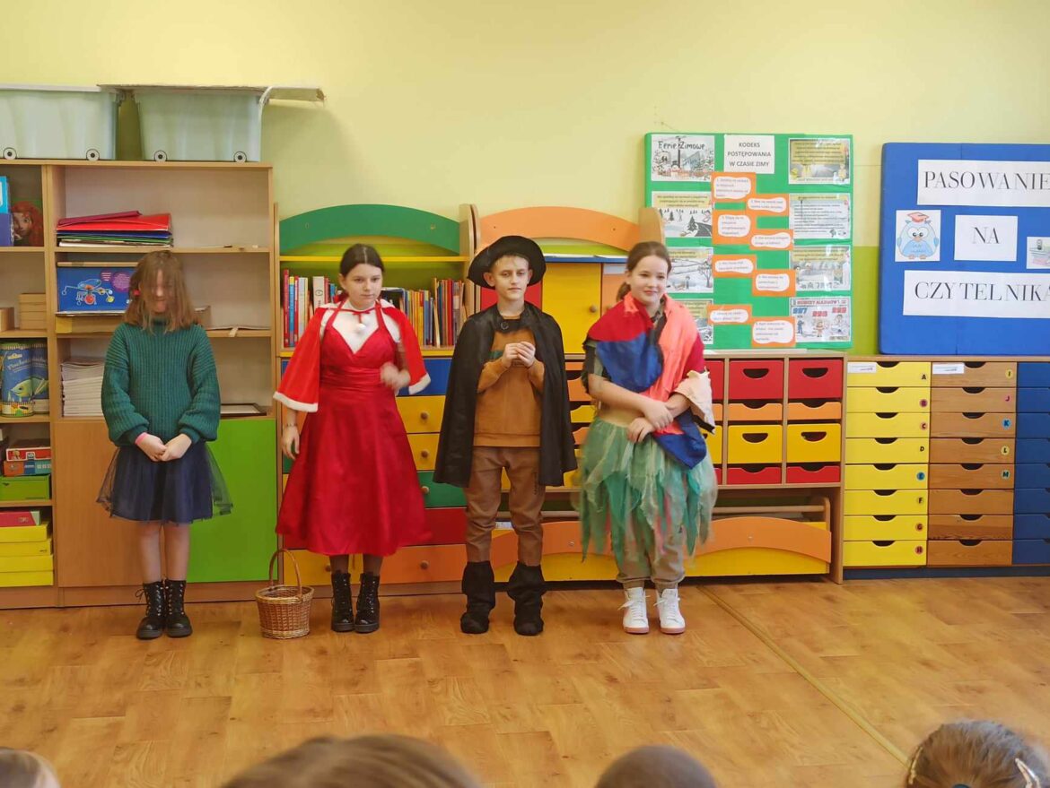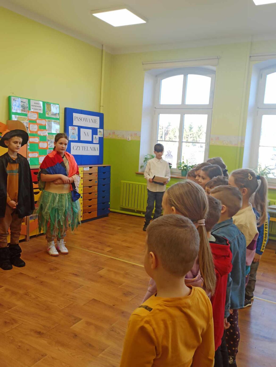 29 stycznia uczniowie klasy I zostali uroczyście pasowani na czytelnika biblioteki szkolnej. Aktyw biblioteczny z tej okazji przygotował inscenizację pt. ,, Zaczarowany Świat Bajek” i zabrał uczniów klasy 1 na spotkanie z bajkowymi postaciami.
