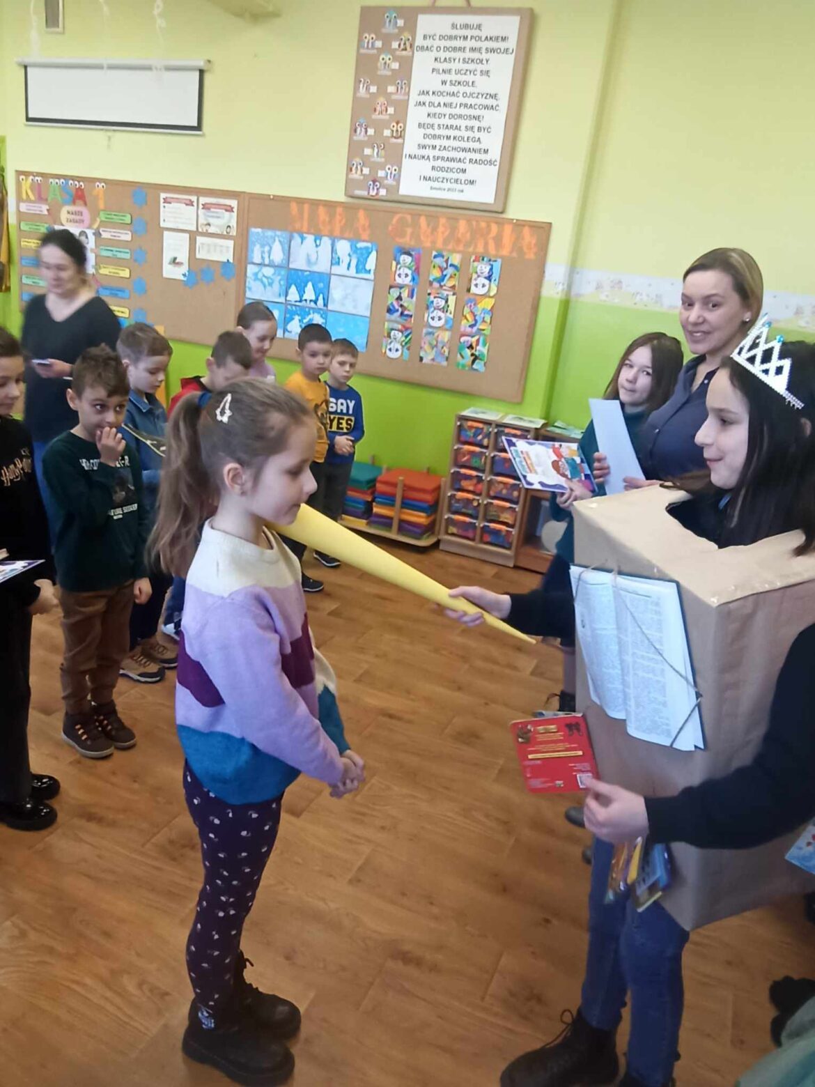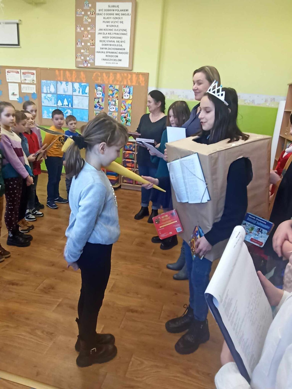 Królowa Książka przedstawiła regulamin biblioteki szkolnej i sprawdziła wiedzę uczniów w dziedzinie bajek. Następnie pierwszoklasiści złożyli uroczystą przysięgę. Pani Dyrektor wręczyła każdemu uczniowi dyplom pasowania na czytelnika, książkę pt. ,, Wnuczka antykwariusza” oraz zakładkę. Następnie uczniowie przeszli do biblioteki szkolnej, gdzie wypożyczyli swoją pierwszą książkę.