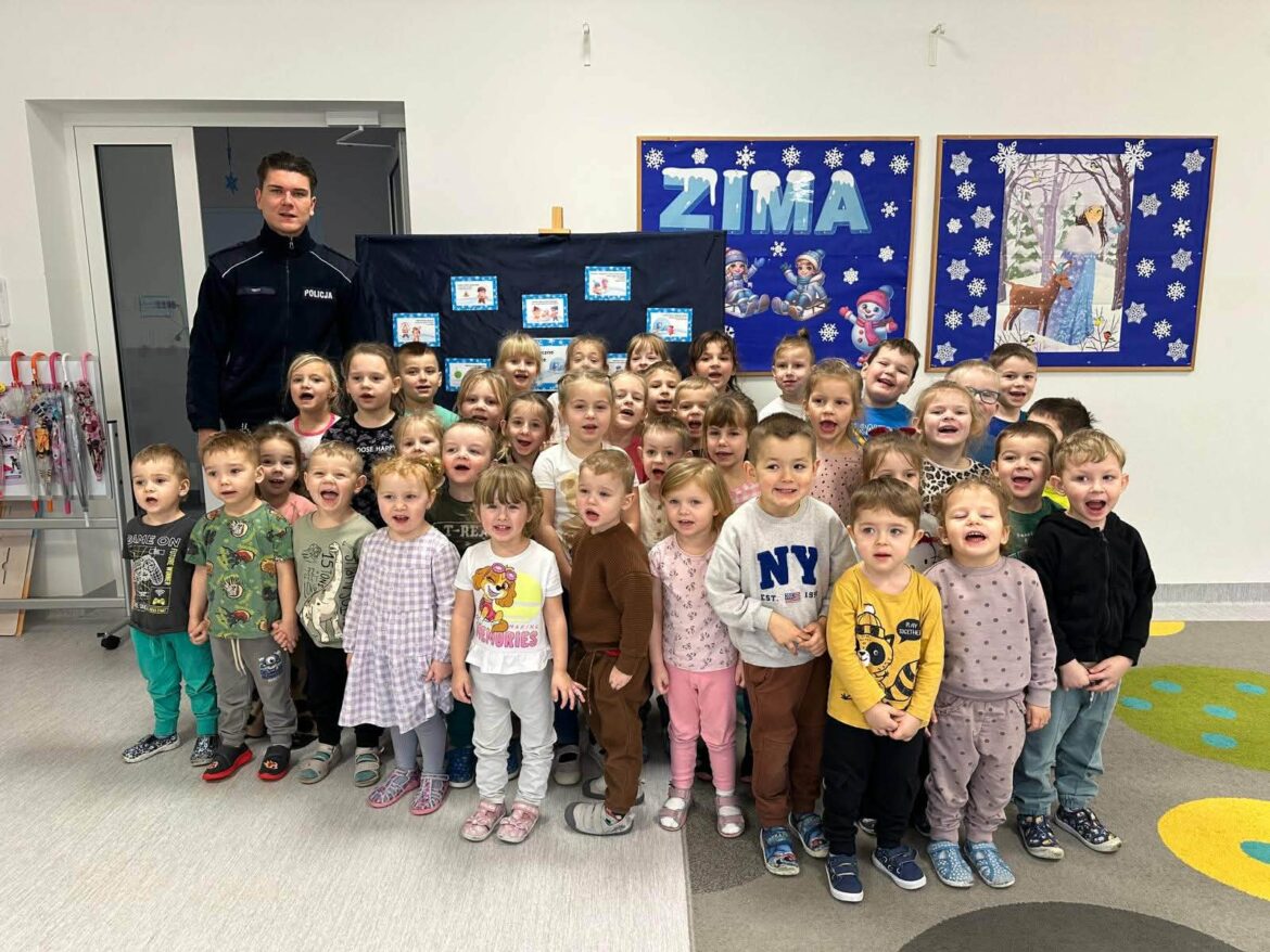 Smolickie przedszkolaki gościły w swojej placówce wyjątkowego gościa – mł. asp. Mateusza Wroneckiego. Spotkanie miało charakter profilaktyczny. Pan dzielnicowy przypomniał dzieciom zasady bezpieczeństwa – jak należy się zachować na drodze, podczas zabaw na śniegu, przy zamarzniętych zbiornikach wodnych oraz gdy spotka się nieznajomych.