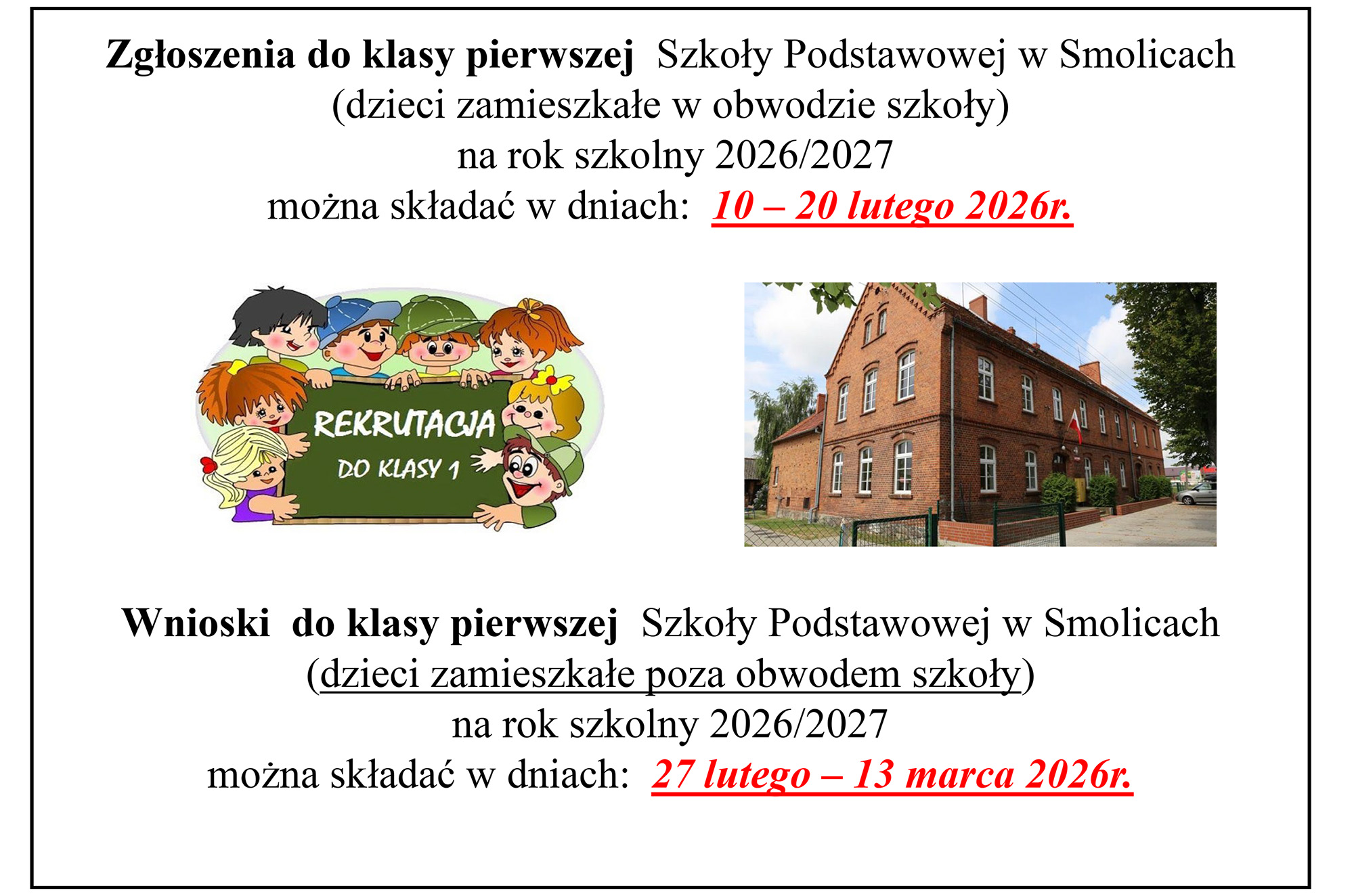 2025/2026KOMUNIKATY / OGŁOSZENIAWszystkie Rekrutacja do klasy 1 na rok szkolny 2026/2027 przez przemo 2026-02-03 2026-02-03 Zgłoszenia do klasy pierwszej (dzieci zamieszkałe w obwodzie szkoły) na rok szkolny 2026/2027 0 komentarz 0 FacebookTwitterPinterestEmail Poprzedni post Rekrutacja do przedszkola na rok szkolny 2026/2027 Następny post Mistrz i mistrzyni szkoły wyłonieni Może Ci się również spodobać Nasze drużyny na podium! 2026-04-14 Obchody Światowego Dnia Osób z Zespołem Downa 2026-04-10 Akcja „Skarpetkowy Zajączek” zakończona sukcesem! 2026-04-10 Nasi reprezentanci na mistrzostwach Wielkopolski 2026-03-30 Recytowali wiersze Marii Konopnickiej 2026-03-30 Ortograficzne zmagania trzecioklasistów 2026-03-27