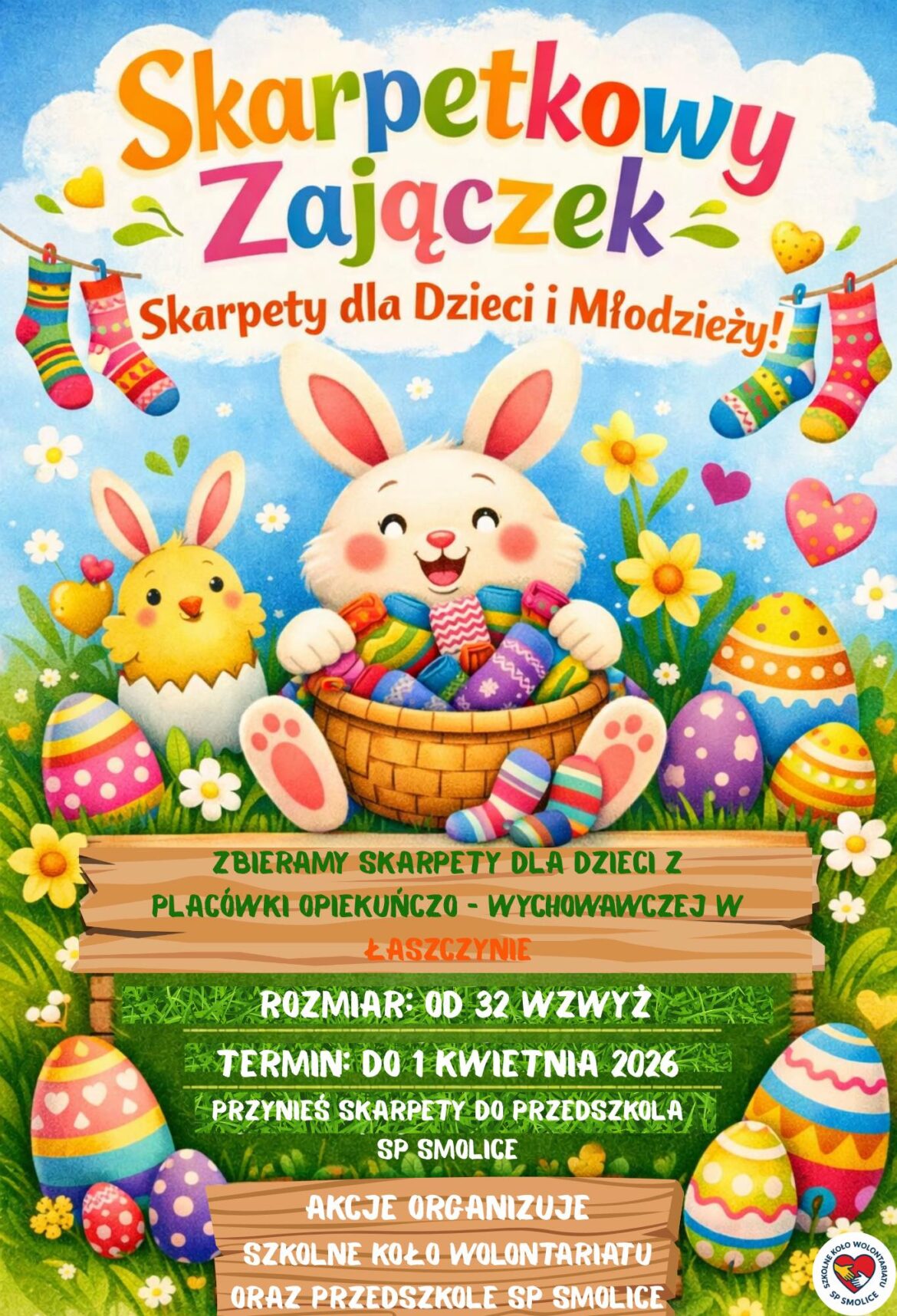 Święta wielkanocne to czas dzielenia się dobrem. Dlatego Szkolne Koło Wolontariatu, we współpracy z paniami z naszego przedszkola, zaprasza do udziału w wyjątkowej akcji. Zbieramy skarpetki dla dzieci i młodzieży z Placówki Opiekuńczo-Wychowawczej w Łaszczynie. Zachęcamy do przyłączenia się do naszej akcji charytatywnej.