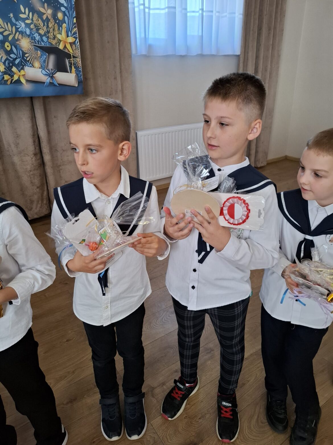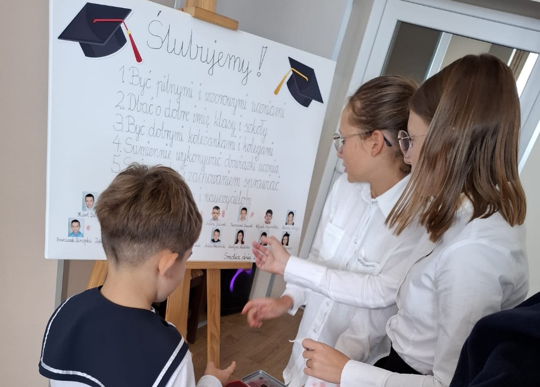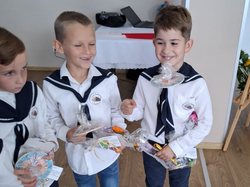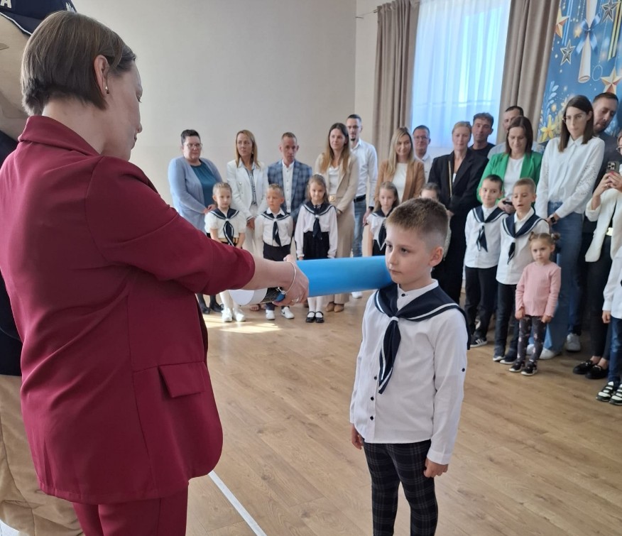 Nasi najmłodsi uczniowie otrzymali pamiątkowe legitymacje szkolne, emblematy z logo szkoły oraz dyplomy. Koledzy i koleżanki z każdej ze starszych klas przygotowali dla pierwszaków drobne upominki, aby ten dzień był dla nich jeszcze bardziej wyjątkowy. W uroczystości wzięli udział również rodzice, którzy z dumą wspierali swoje pociechy w tym ważnym dniu. Serdeczne podziękowania kierujemy do panów policjantów – podkom. Piotra Szczepaniaka z KPP w Krotoszynie oraz dzielnicowego, mł. asp. Mateusza Wroneckiego. Dziękujemy wszystkim, którzy przyczynili się do organizacji tego pięknego wydarzenia – nauczycielom, uczniom i rodzicom. Dzięki Wam dzień ślubowania naszych pierwszoklasistów stał się niezwykłym i niezapomnianym świętem!
