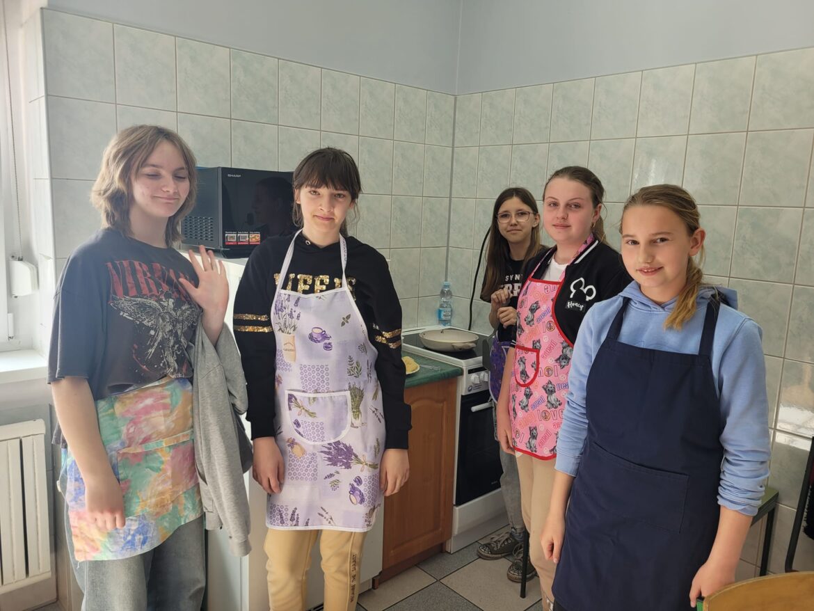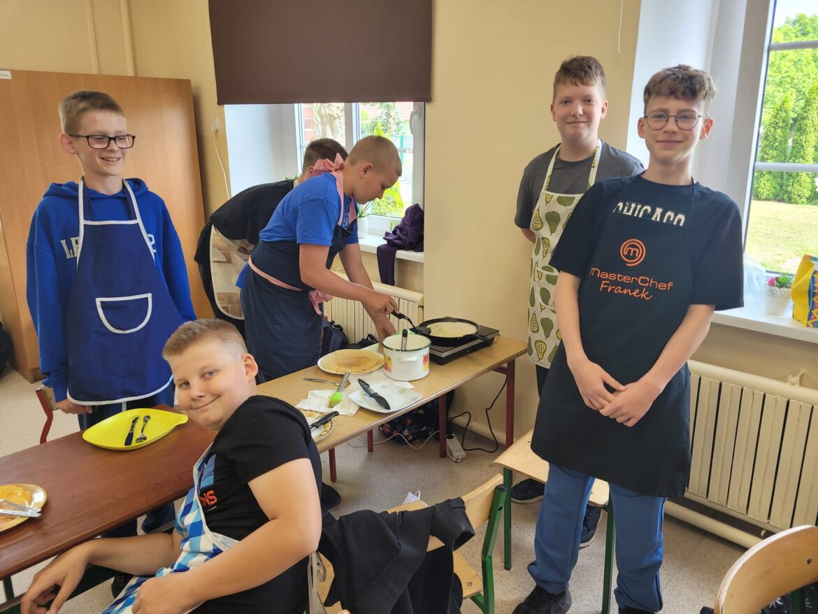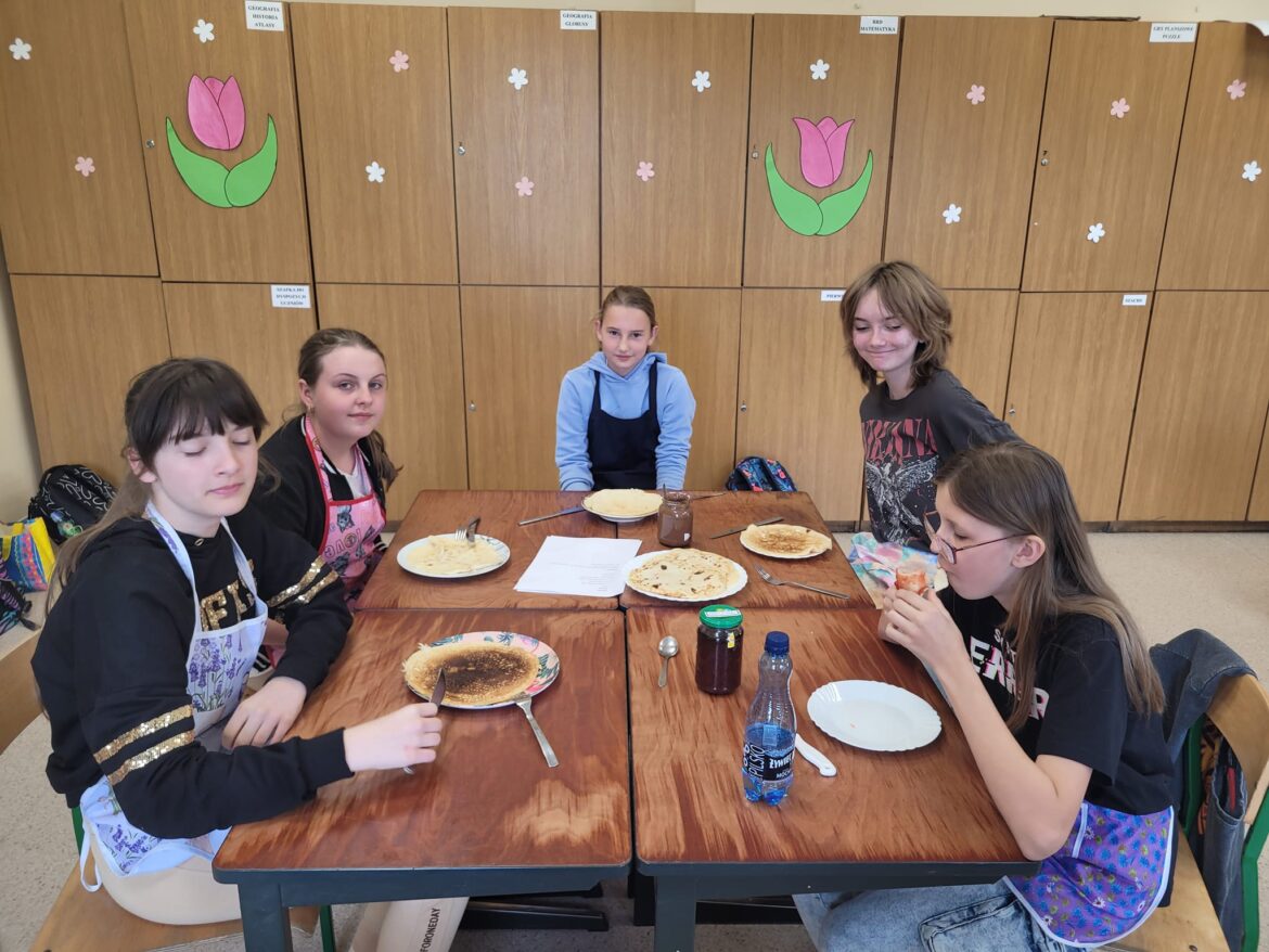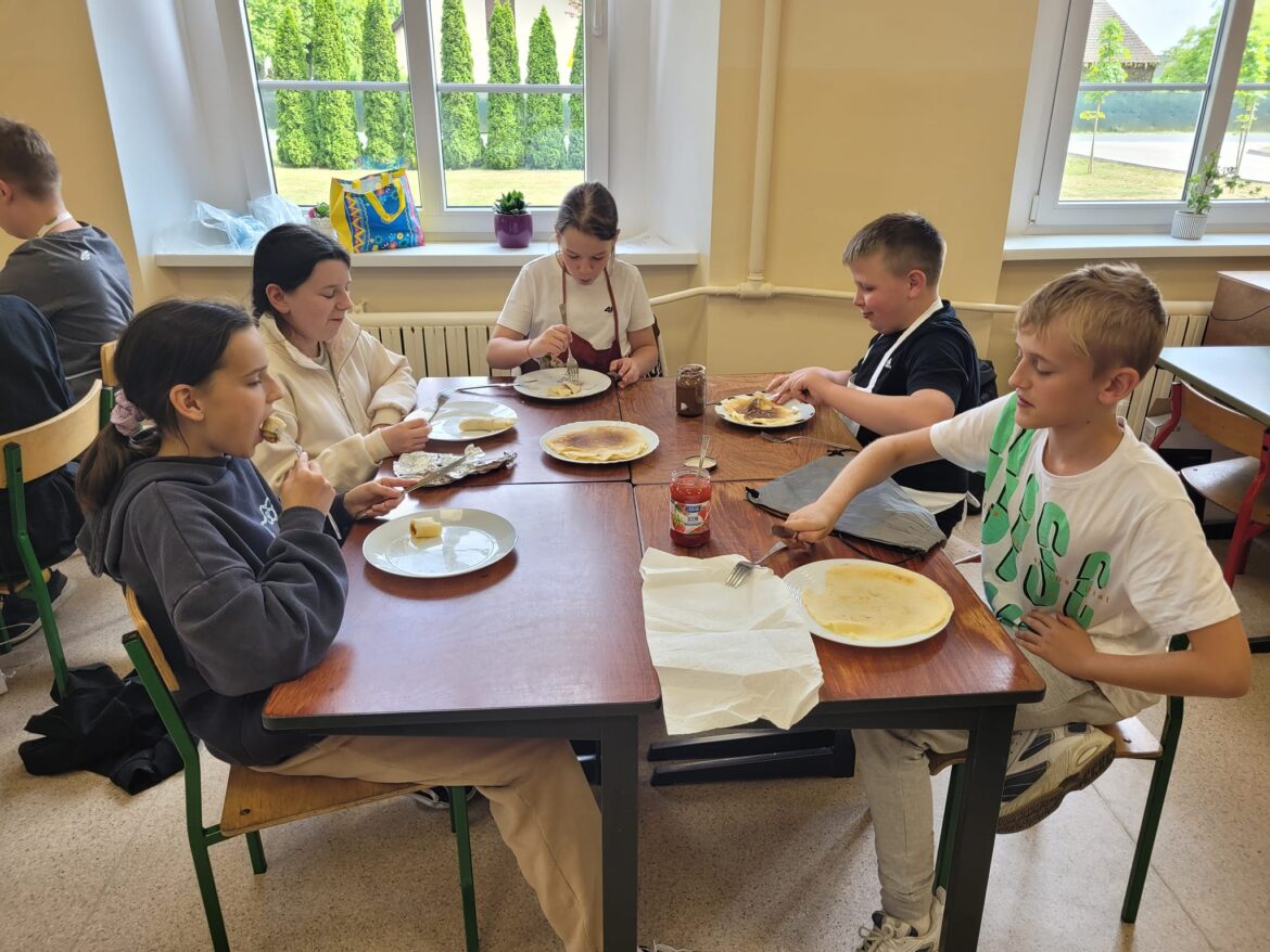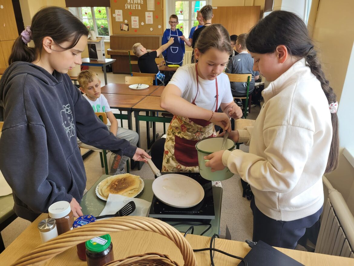 Na zajęciach kulinarnych 10 maja uczniowie klasy 6 samodzielnie przygotowali ciasto, z którego następnie upiekli przepyszne naleśniki.